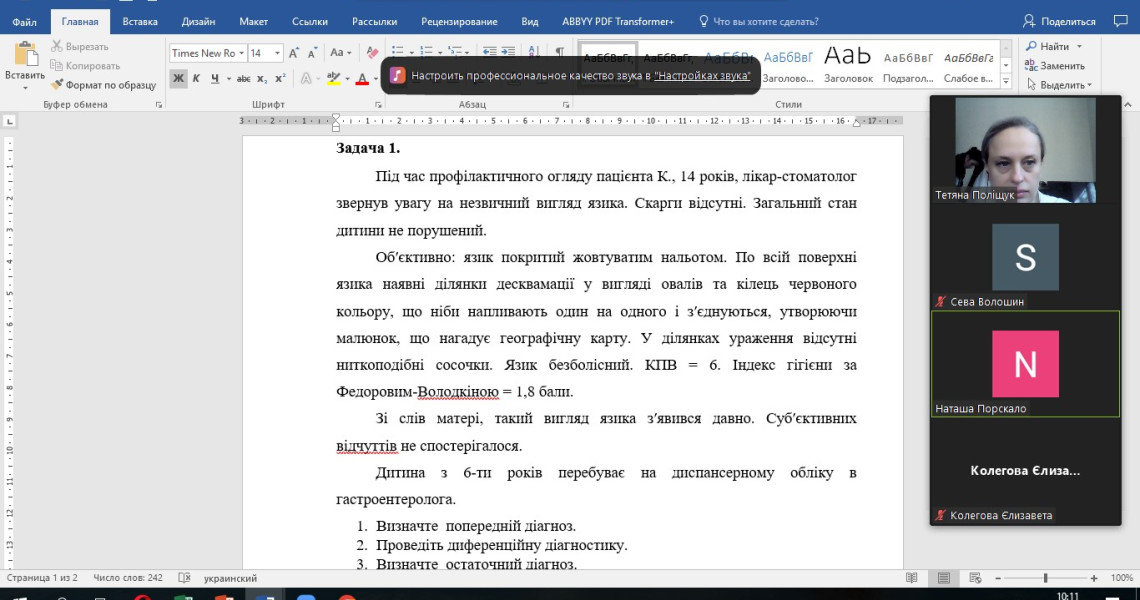 Доценти Т.В. Поліщук, В.П. Труфанова та асистенти кафедри К.С. Казакова, А.І. Максименко та А.С. Мосієнко велику увагу приділяють заняттям із лікарями-інтернами в дистанційному форматі. У центрі їхньої уваги – формування клінічного мислення лікарів-інтернів за допомогою вирішення ситуаційних задач і розгляду клінічних випадків.