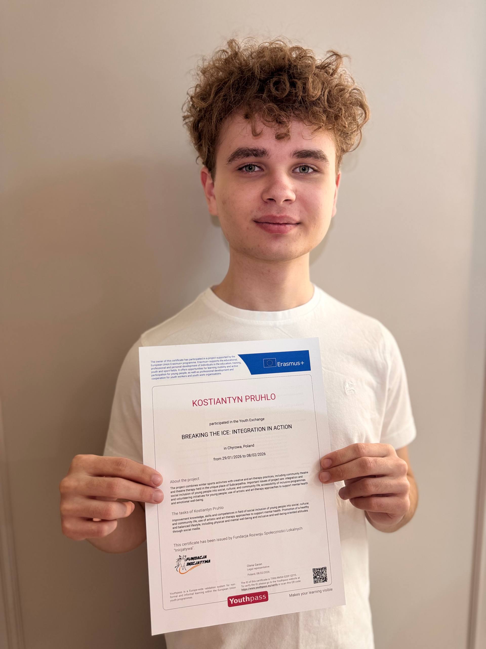 Здобувач освіти 3 групи 1 курсу стоматологічного факультету ПДМУ Костянтин Пругло в рамках програми Ерасмус + та реалізації права на академічну мобільність взяв участь в проєкті «Breaking The Ice: Integration In Action» (Польща). Основною метою стажування було отримання знань, навичок та компетенцій soft skills учасниками обміну у сферах пропаганди здорового способу життя, соціальної інтеграції молоді, арт-терапії, неформальної освіти та волонтерських ініціатив.