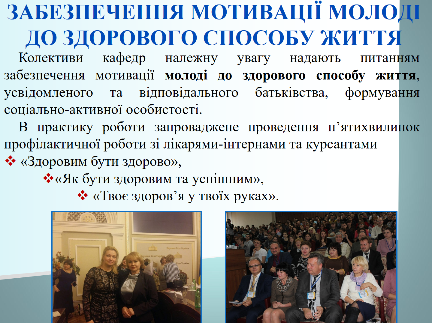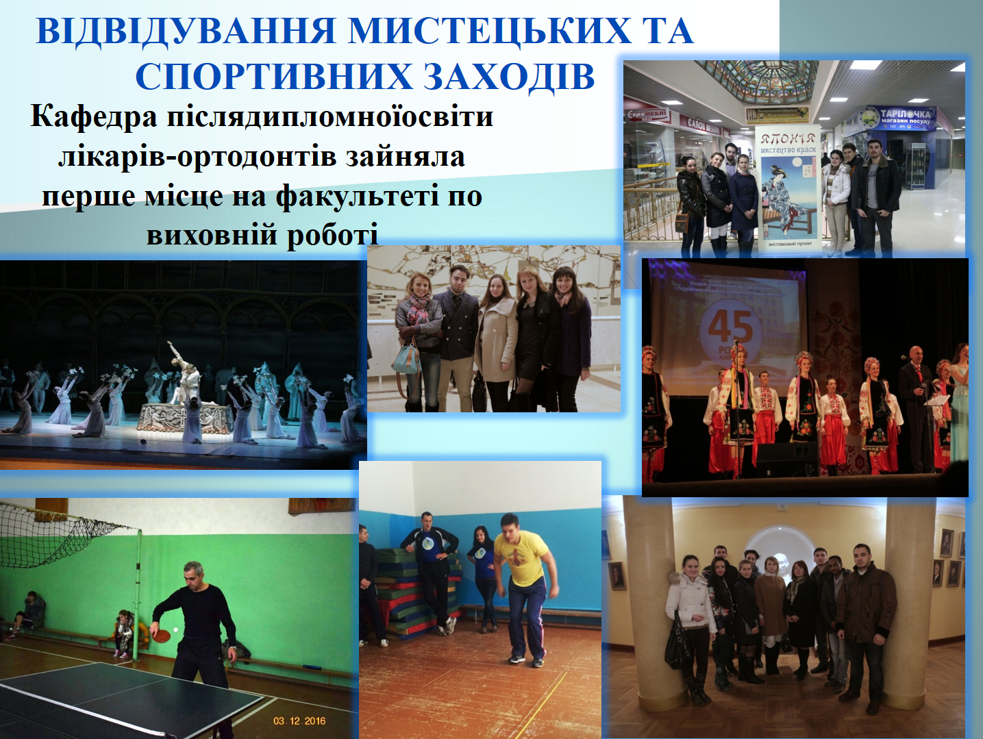 5 грудня 2018 року адміністрація Навчально-наукового інституту післядипломної освіти спільно з Центром управління освітньо-виховною роботою з молоддю провели для лікарів-інтернів комунікативно-виховну інтерактивну лекцію з питань торгівлі людьми, безпечної міграції, попередження рабства, правових аспектів роботи за кордоном.