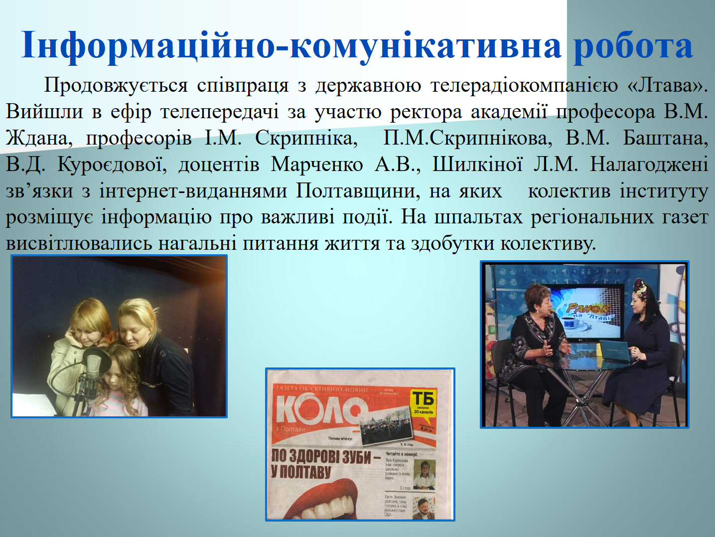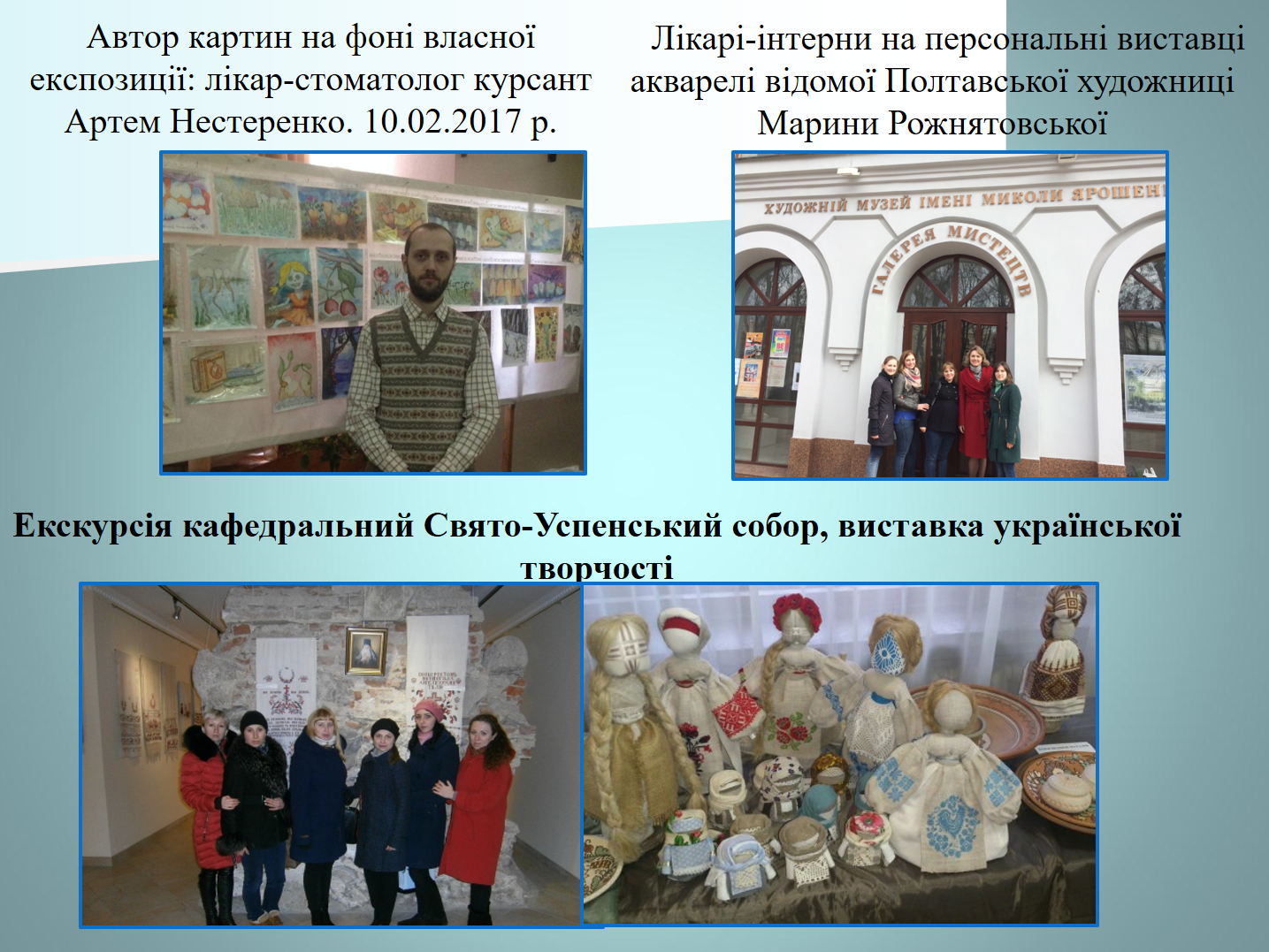 «Випадковостей не буває, — стверджує зав. кафедри післядипломної освіти лікарів-ортодонтів УМСА, професор В.Д. Куроєдова. — З науковцями із Полтавського літературно-меморіального музею В.Г. Короленка ми давно підтримуємо дружні зв’язки, тож, коли почули, що у них є «цікавинки» про перебування Т.Г. Шевченка на Полтавщині, відразу ж запросили провідного наукового співробітника музею Л.В. Ольховську на зустріч з нашими слухачами».