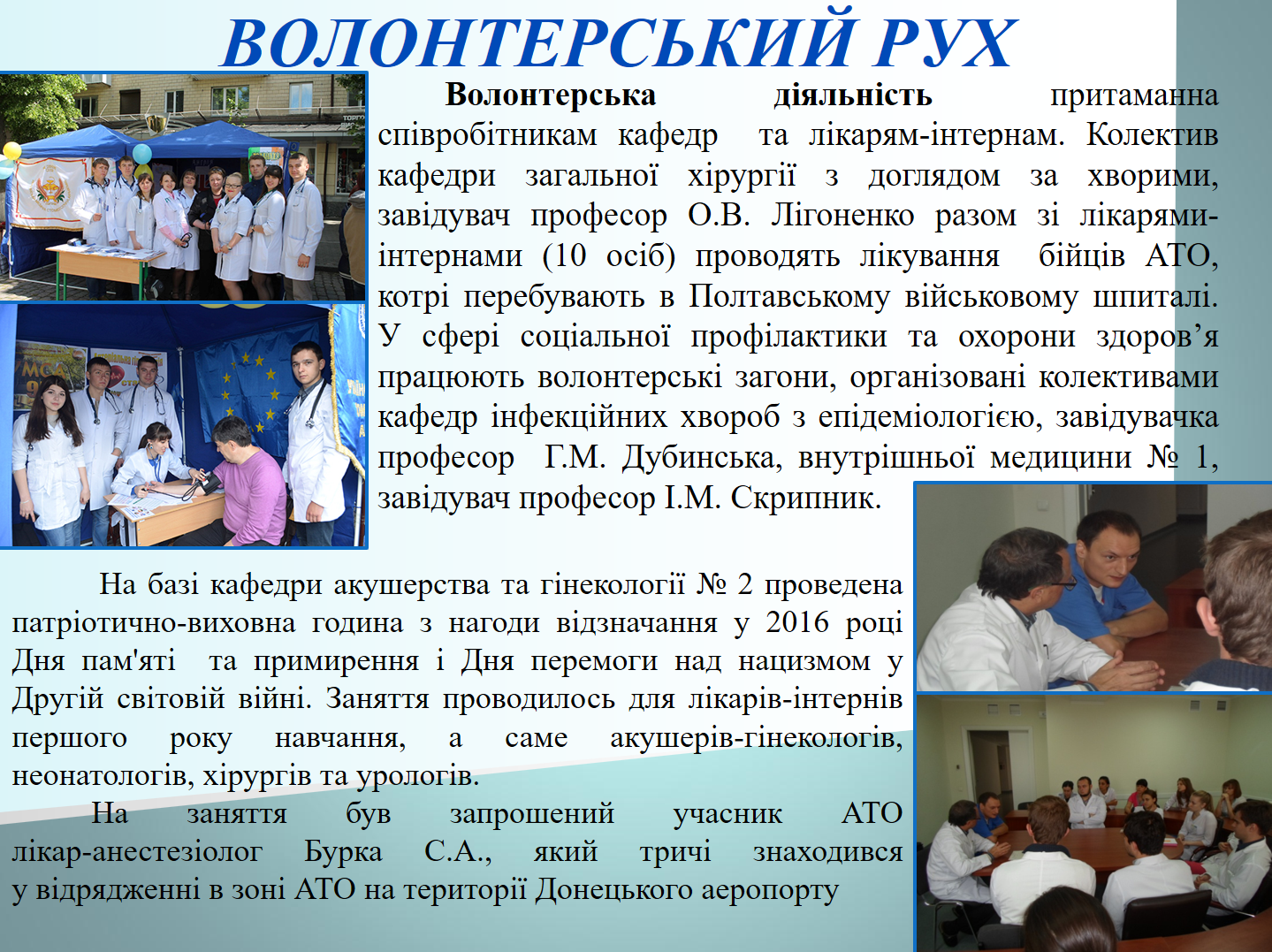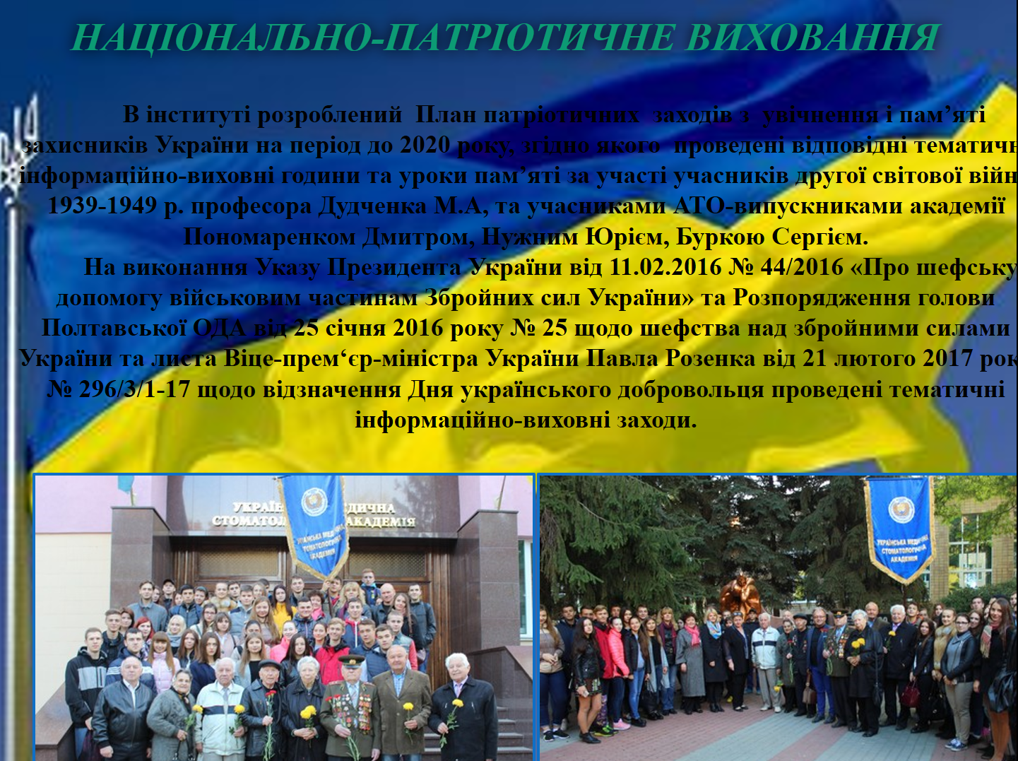 Захід проводили співробітники кафедри Мельник В.Л., Гуржій О.В., які підвели підсумки, підкреслили необхідність патріотичної роботи серед лікарів-стоматологів для формування лікарів-патріотів Україри.