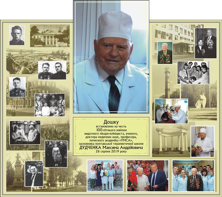 26 серпня 2019 року виповнилося 100 років від дня народження видатного вченого, лікаря, д.мед.н., професора, ветерана Другої Світової війни, професора кафедри внутрішньої медицини №1 Дудченка Максима Андрійовича.
