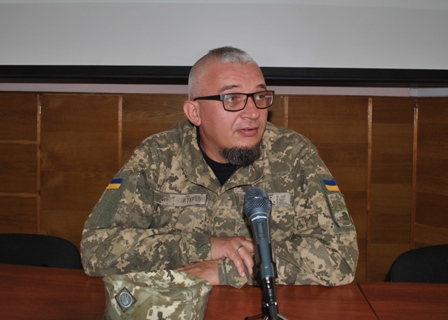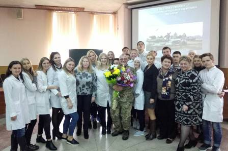 На зустріч зі студентами стоматологічного та медичного факультетів був запрошений боєць славнозвісної 92-гої механізованої бригади ЗСУ (позивний "Професор"), він же керівник «Центру допомоги учасникам АТО в Полтавській області» – Валерій Довженко. Зустріч підготувала і вела викладач кафедри філософії та суспільних наук, к.н.держ.упр. Таміла Гладка.