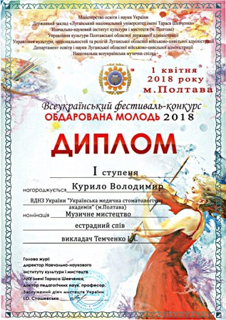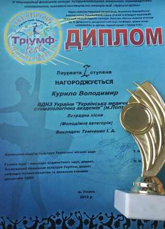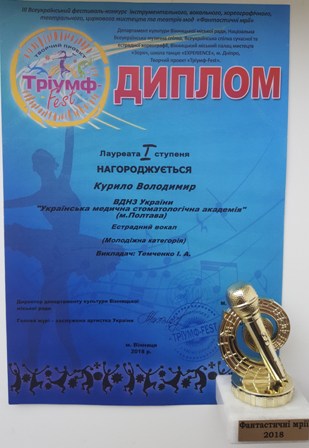 Деканат стоматологічного факультету вітає Прокопенко Іллю – студента 2 курсу стоматологічного факультету, який зайняв ІІІ місце в обласному фестивалі «Здорова молодь – здорова нація»!
