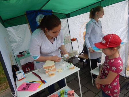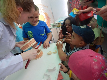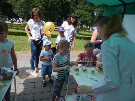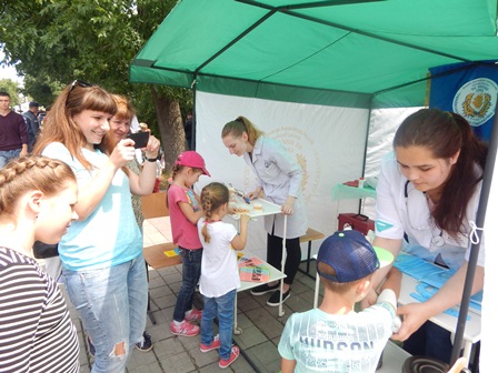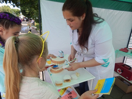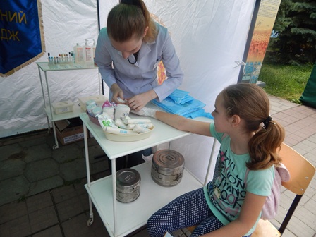 У «місті професій» колектив медичного коледжу презентував професію медичної сестри. За правилами проведення заходу після коротеньких майстер – класів усі бажаючі дітлахи мали можливість самотужки виконати практичні навички, зокрема з підготовки перев’язувального матеріалу, накладання пов’язок, догляду за порожниною рота, одягання стерильного халату та отримати свою першу «заробітню платню».