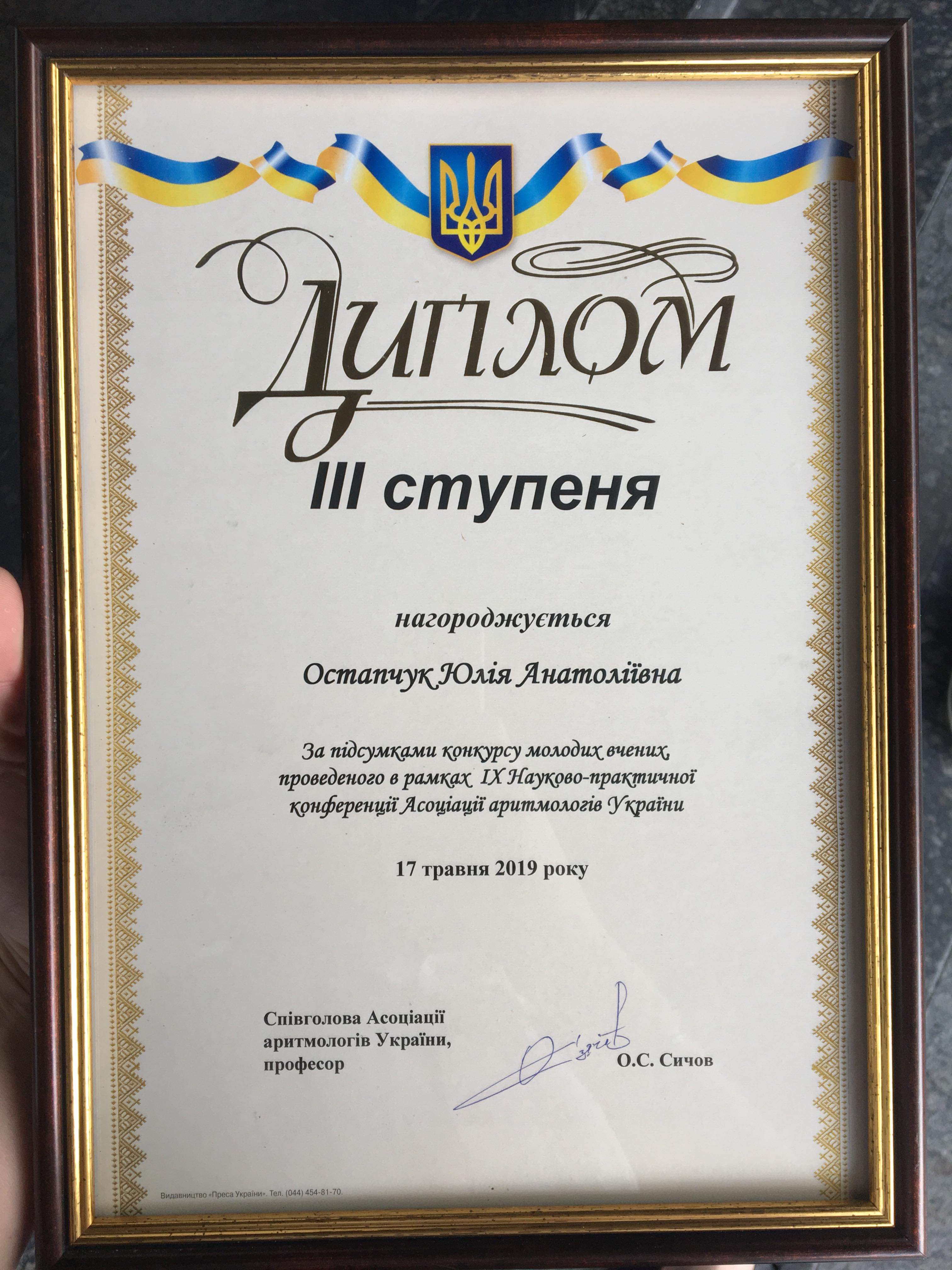 В конференції приняла участь Остапчук Юлія Анатоліївна кафедра внутрішніх хвороб та медицини невідкладних станів з шкірними та венеричними хворобами "УМСА" з темою доповіді "Поетапна діагностика, медикаментозна та хірургічна корекція поліморфної шлункової тахікардії у хворого з післяінфарктним кардіосклерозом", за підсумками конкурсу посіла одне з призових місць, та була нагороджена дипломом ІІІ ступеня.