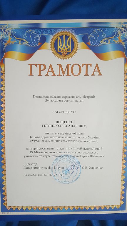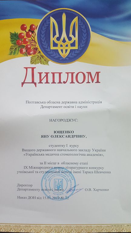 Українська медична стоматологічна академія, деканат стоматологічного факультету, кафедра українознавства та гуманітарної підготовки щиро вітають студентку стоматологічного факультету Ющенко Яну за ІІ місце в ІІІ етапі ІХ Міжнародного мовно-літературного конкурсу учнівської та студентської молоді імені Т.Г. Шевченка. Студентку до участі в конкурсі підготувала доцент, зав. кафедри українознавства та гуманітарної підготовки Лещенко Т.О.