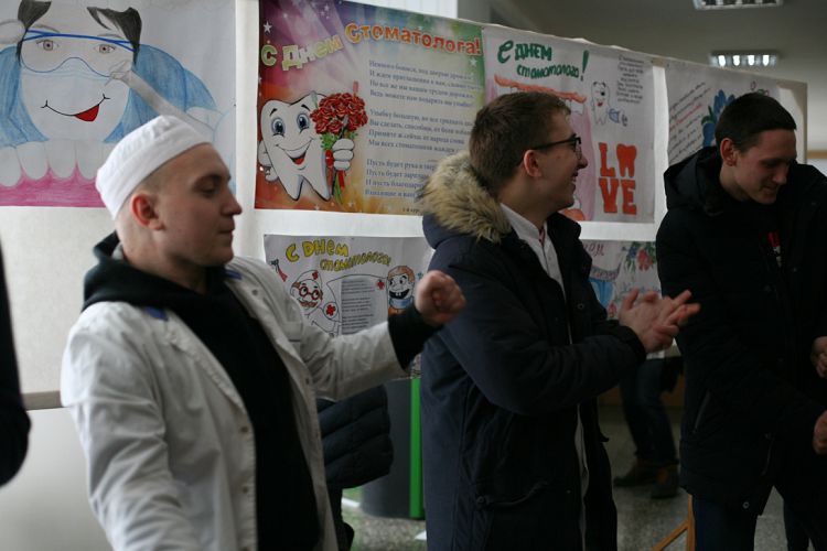 Напередодні Міжнародного Дня стоматолога в академії стоматологічний деканат разом із студентами першого та п’ятого курсів організували свято. Ще з самого ранку працівникам підіймала настій гарно прикрашена академія: усміхнені різнокольорові зубки, яскраві вітальні плакати, виставка на стоматологічну тематику в бібліотеці. Святкова частина тривала на довгій перерві в холі адміністративного корпуса, під час якої до присутніх із вітальним словом звернулася декан стоматологічного факультету Сидорова Алла Іванівна. Свято продовжили студенти 5 курсу, які провели веселу музичну ігрову вікторину на стоматологічну тематику. Всіх присутніх нагородили призами та пряниками у вигляді зубів. На жаль, 30 хвилин для святкової програми було недостатньо, але студентам потрібно було йти на навчання та продовжувати вивчати ази стоматології.